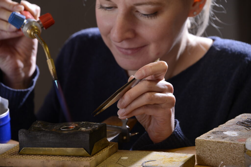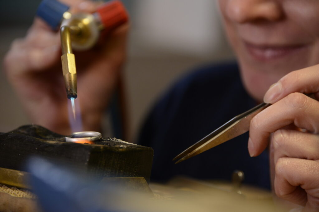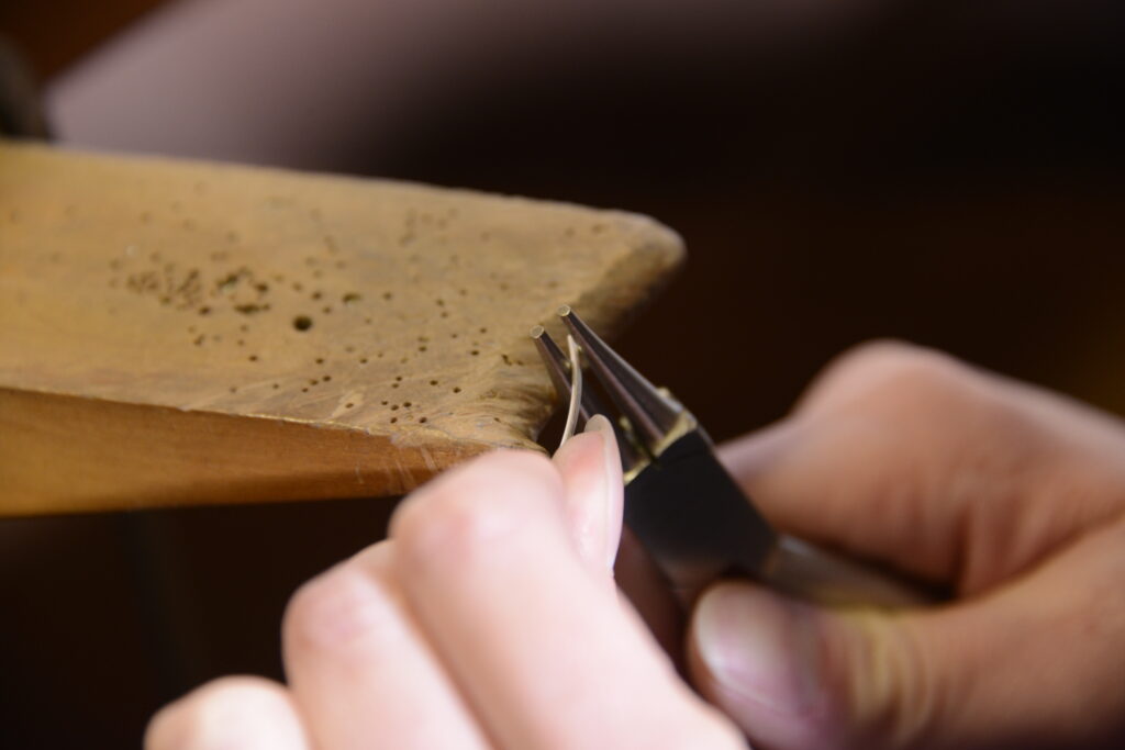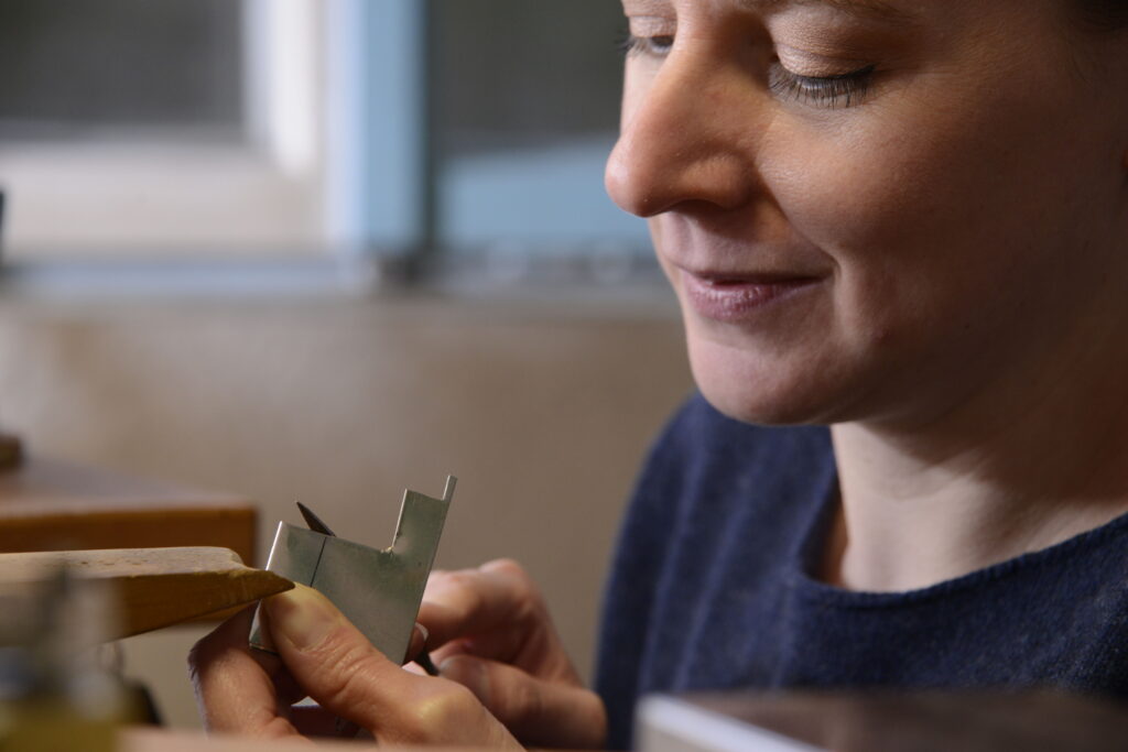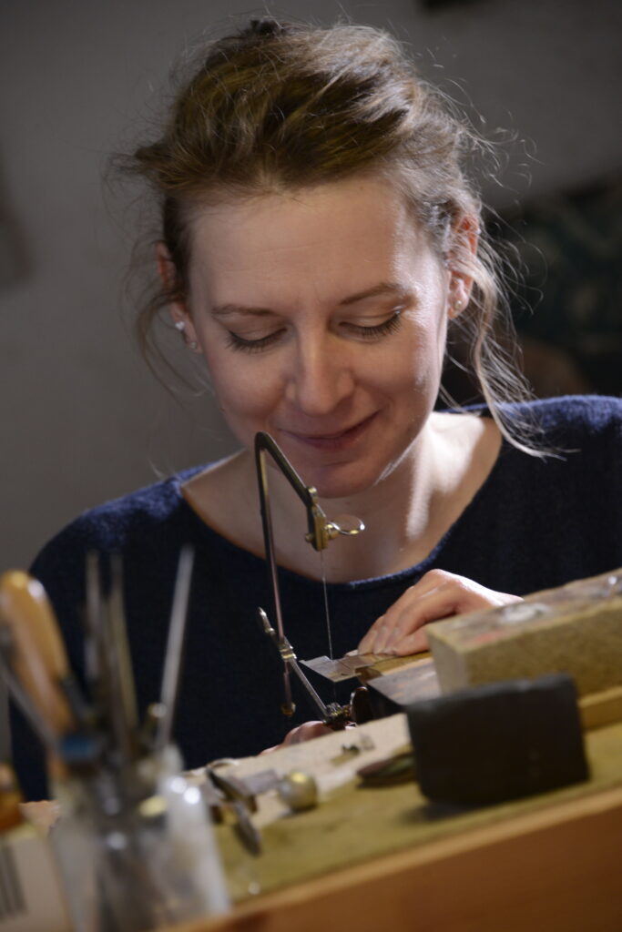 Das Sägen von Hand gehört zu den spanenden Trennverfahren und ist mit dem Metall-Laubsägebogen eine typische Goldschmiedearbeit.