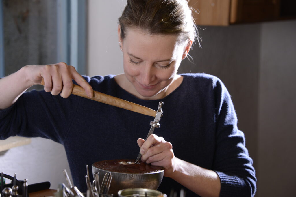 Ein zu ziselierender Gegenstand (Blech o. ähnliches) wird zur Bearbeitung auf der Ziselierkugel aufgekittet.